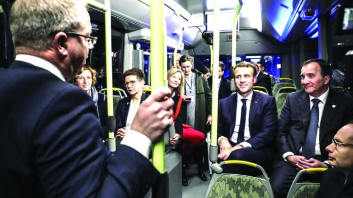 ΛΕΖΑΝΤΑ: O Γάλλος Πρόεδρος Μακρόν και ο Σουηδός Πρωθυπουργός Στέφαν Λεβέν (δεξιά) έχουν πάρει το λεωφορείο – πράγμα καθόλου ασυνήθιστο για πολιτικούς στη Σουηδία