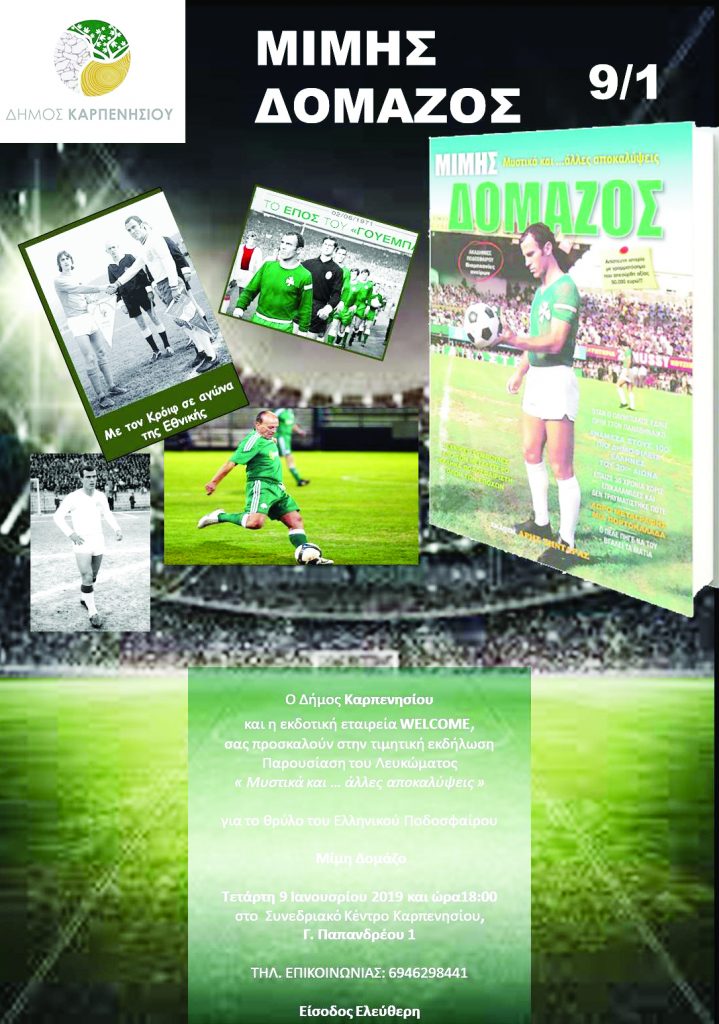 Τετάρτη 9/1/2019 στο Καρπενήσι (Συνεδριακό Κέντρο) θα πραγματοποιηθεί Τιμητική εκδήλωση – Παρουσίαση. Το λεύκωμα αφιέρωμα στη ζωή του θρύλου του Ελληνικού ποδοσφαίρου με τίτλο ‘Μυστικά και … άλλες αποκαλύψεις’’ παρουσιάζεται με την υποστήριξη του Δήμου Καρπενησίου. Είσοδος ελεύθερη | Ώρα 18.00 μ.μ.