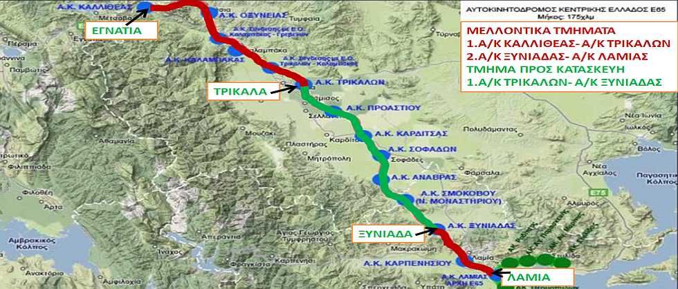 Στην πλήρη ανάπτυξη, μετά την κατασκευή τόσο του νότιου όσο και του βόρειου τμήματος, ο αυτοκινητόδρομος Κεντρικής Ελλάδος Ε65 θα εκτείνεται σε μήκος 175 χιλιομέτρων και θα ενώνει την Λαμία με την Εγνατία Οδό. Ανάδοχος του έργου είναι ο Όμιλος ΓΕΚ ΤΕΡΝΑ, μετά τον σχετικό διεθνή διαγωνισμό του 2008.