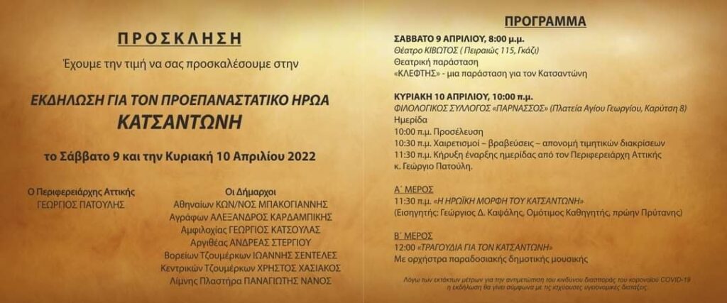 Το επόμενο Σαββατοκύριακο, 7 Δήμοι μαζί με την Περιφέρεια Αττικής, σε ένα διήμερο εκδηλώσεων υψηλού επιπέδου τιμούν τον Προεπαναστάτη ήρωα των Αγράφων Αντώνη Κατσαντώνη.