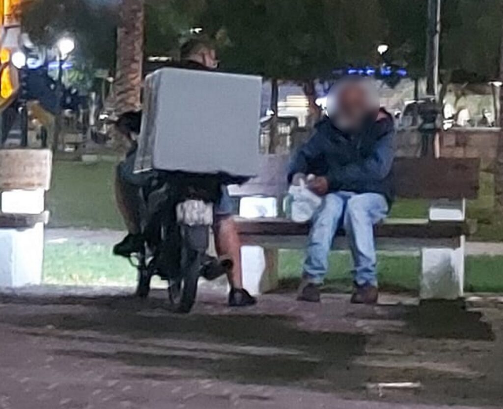 Όπως ανέφεραν αυτόπτες μάρτυρες, ο ντελιβεράς που παλεύει για το μεροκάματο και εργάζεται με τις ώρες πάνω σε ένα μηχανάκι, τον πλησιάζει με το δίκυκλο και κατευθύνεται στο παγκάκι. Η εικόνα με το μηχανάκι που ανεβαίνει πάνω στην πλατεία κεντρίζει την προσοχή των περαστικών και όσων κάθονται κοντά. Ξαφνικά το παιδί βγάζει από το κουτί στο μηχανάκι του μία σακούλα και προσφέρει σε αυτόν τον εγκαταλειμμένο γέροντα φαγητό.