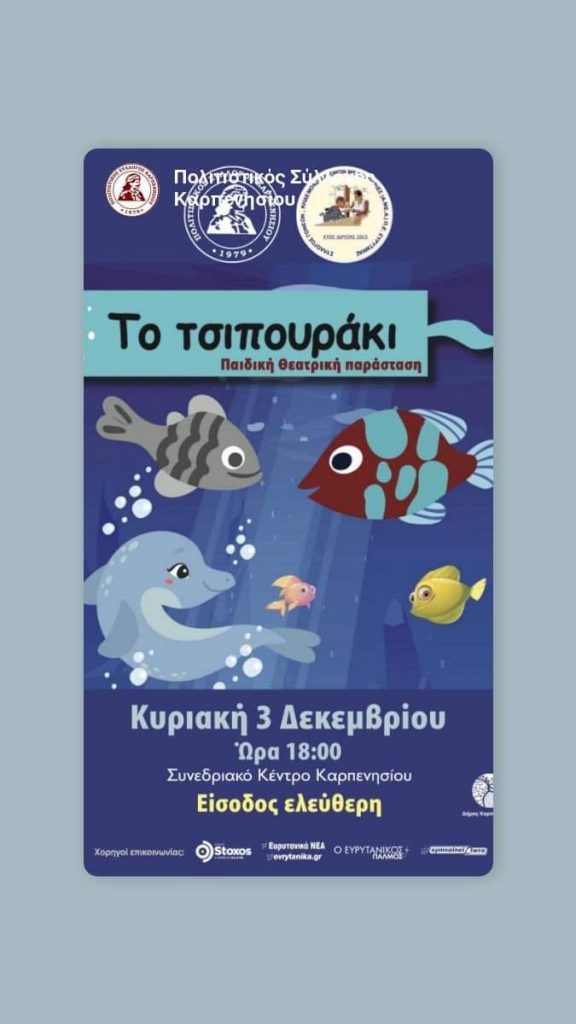 Την Κυριακή 3 Δεκεμβρίου στις 18:00 το παιδικό θεατρικό εργαστήρι του Πολιτιστικού Συλλόγου Καρπενησίου θα μεταφέρει στη σκηνή του Συνεδριακού κέντρου, το βιβλίο της Αναστασίας Κριπάση-Μπάρκα «Το Τσιπουράκι» στα πλαίσια των εορτών της εβδομάδας για την αναπηρία, από τον Σύλλογο Γονέων και Κηδεμόνων ατόμων με αναπηρία ΠΕ Ευρυτανίας.