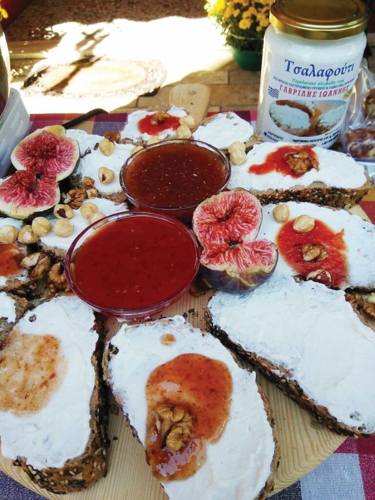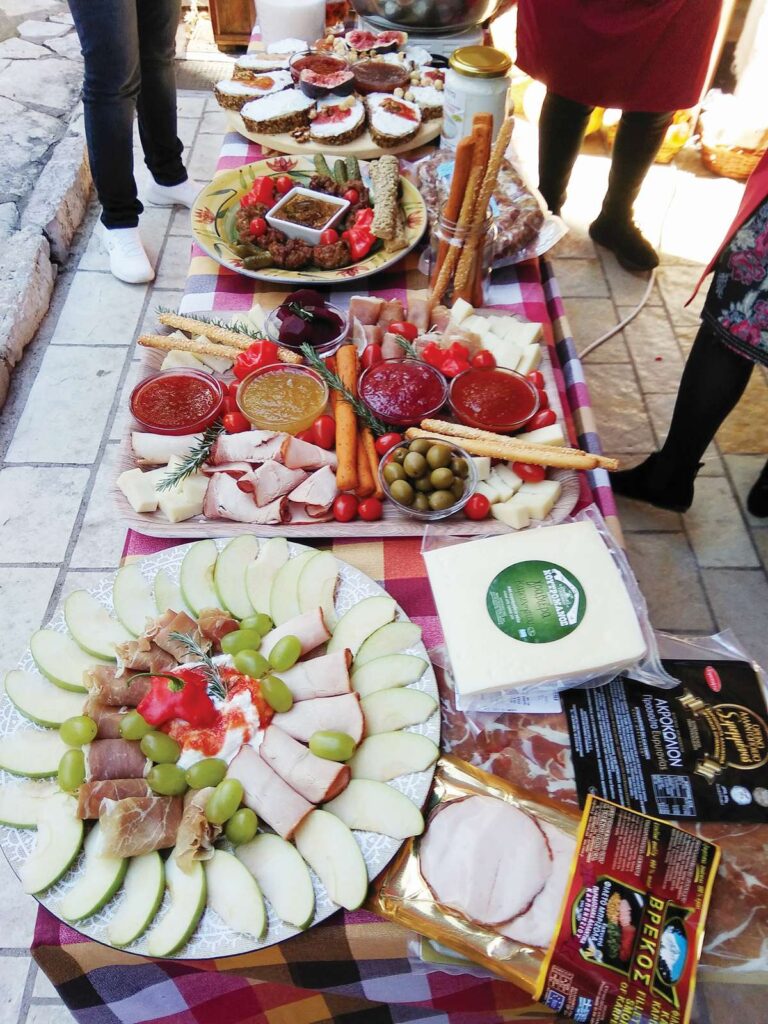 Τσαλαφούτι και γραβιέρα Ευρυτανίας, χοιρινό λουκάνικο, καπνιστή μπριζόλα και προσούτο, συνδυασμένα με γλυκές μαρμελάδες για αλλαντικά και τυριά, ντομάτα με βασιλικό, ντομάτα με μπούκοβο, πεπόνι με γλυκάνισο, κορόμηλο με μοσχοκάρυδο και γλυκόξινες κράνι, σύκο, ντομάτα.