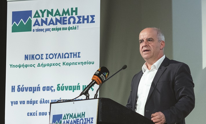 Ασφυκτικά γέμισε το βράδυ της Κυριακής 24 Μαρτίου 2019, το Συνεδριακό Κέντρο Καρπενησίου στην παρουσίαση του συνδυασμού «Δύναμη Ανανέωσης, ο τόπος μας ακόμα πιο ψηλά», επικεφαλής του οποίου είναι ο νυν Δήμαρχος Καρπενησίου κ. Νίκος Σουλιώτης. Άνθρωποι όλων των ηλικιών παρευρέθηκαν στο χώρο του Συνεδριακού, προκαλώντας συνωστισμό, με σκοπό να στηρίξουν με την παρουσία τους τον συνδυασμό και να συγχαρούν από κοντά τους υποψηφίους. Στην εκδήλωση παρευρέθηκαν ο Περιφερειάρχης Στερεάς Ελλάδας Κώστας Μπακογιάννης, ο Αντιπεριφερειάρχης Π.Ε. Ευρυτανίας Τασιός Αριστείδης και ο Βουλευτής Ευρυτανίας κ. Κώστας Κοντογεώργος, η υποψήφια Βουλευτής Ευρυτανίας κ. Θωμαϊς Οικονόμου και ο υποψήφιος Βουλευτής Ευρυτανίας κ. Κλεομένης Λάππας και πλήθος κόσμου. Αναμεσά τους σύσσωμη η οικογένεια του κ. Σουλιώτη, η σύζυγός του, τα παιδιά και η μόλις λίγων μηνών εγγονή του.