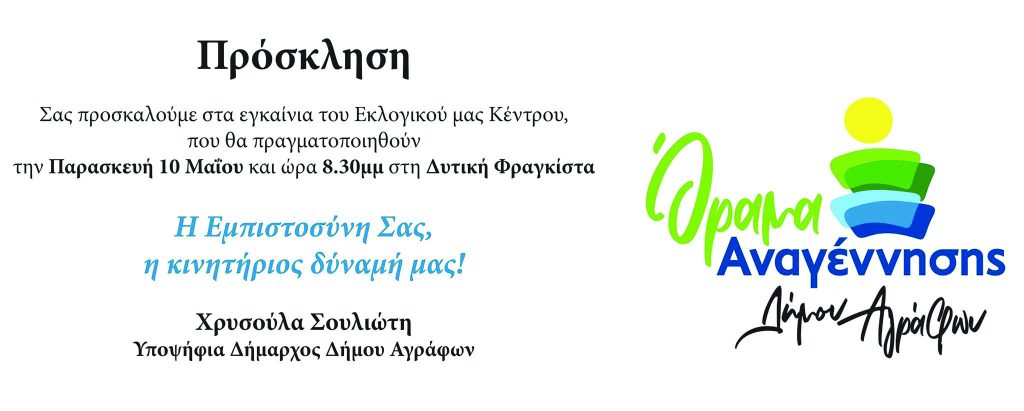 Παρασκευή 10/5/2019 Δυτική Φραγκίστα Παρουσίαση συνδυασμού ‘ΟΡΑΜΑ ΑΝΑΓΕΝΝΗΣΗΣ’ της υποψήφιας Δημάρχου Αγράφων Χρυσούλας Σουλιώτη | Ώρα 20.00 μ.μ.