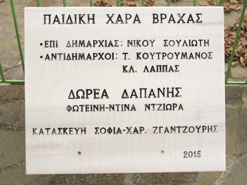 Πρόκειται για μια μαρμάρινη πλάκα που είχε τοποθετηθεί στην παιδική χαρά Βράχας εδώ και μερικά χρόνια, για να ξεσηκώσει σήμερα σχόλια και αντιδράσεις για την αναλυτική αναφορά στα ονόματα της Δημοτικής Αρχής, στις ημέρες της οποία η παιδική χαρά’ πήρε σάρκα και οστά’.