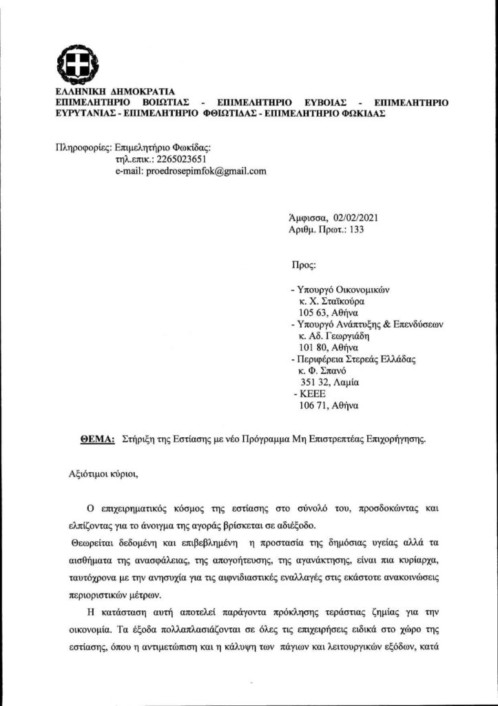 Στην επιστολή περιγράφονται τα προβλήματα του κλάδου, που έχει πληγεί περισσότερο από την πανδημία του κορονωϊού. Μέσω της παρεμβάσεως αυτής τα Επιμελητήρια της Στερεάς Ελλάδας καλούν την κυβέρνηση να υιοθετήσει τα προτεινόμενα οικονομικά μέτρα για την ανακούφιση των επιχειρηματιών και των οικογενειών τους καθώς και την ανάκαμψη του κλάδου όταν παρέλθει η πανδημία.
