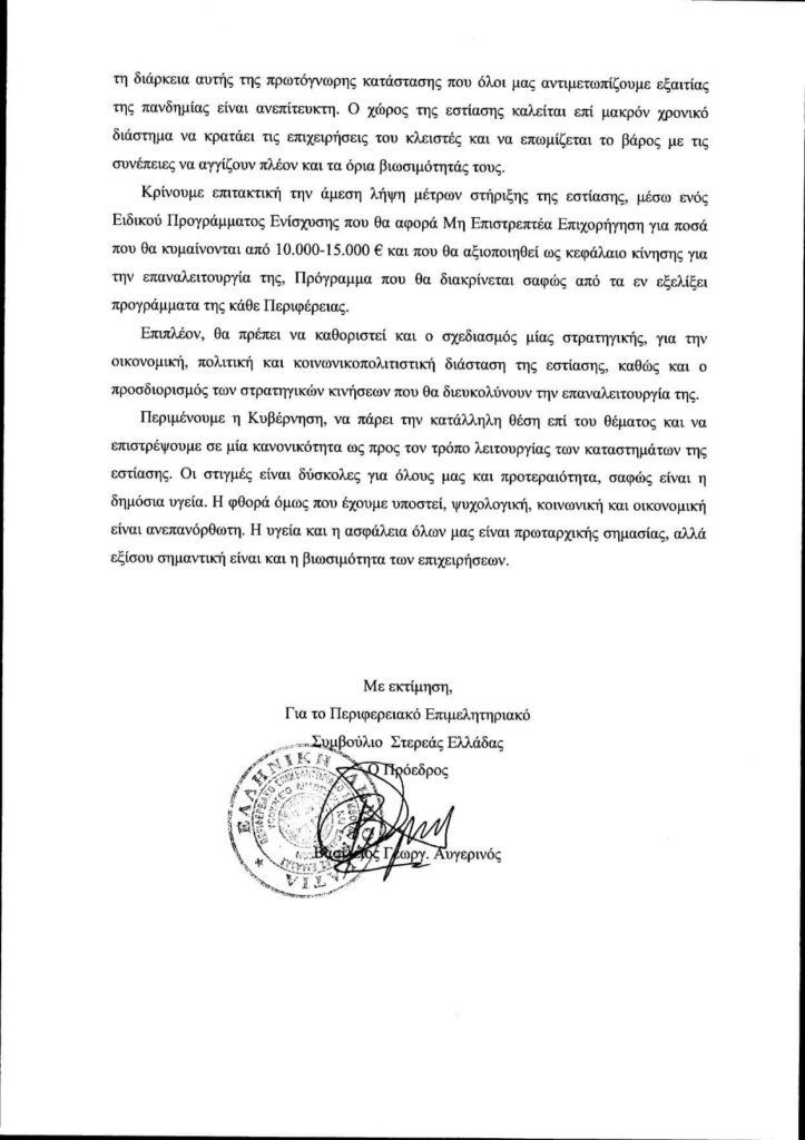 Στην επιστολή περιγράφονται τα προβλήματα του κλάδου, που έχει πληγεί περισσότερο από την πανδημία του κορονωϊού. Μέσω της παρεμβάσεως αυτής τα Επιμελητήρια της Στερεάς Ελλάδας καλούν την κυβέρνηση να υιοθετήσει τα προτεινόμενα οικονομικά μέτρα για την ανακούφιση των επιχειρηματιών και των οικογενειών τους καθώς και την ανάκαμψη του κλάδου όταν παρέλθει η πανδημία.