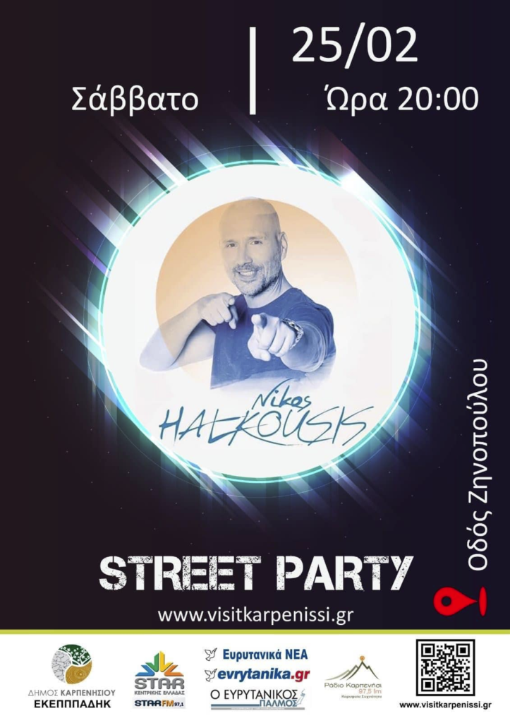 Σάββατο 25 Φεβρουαρίου 2023 | Ώρα: 20.00 STREET PARTY με μουσικές επιλογές από τον Dj’ Νίκο Χαλκούση Ευρυτανικός Παλμός 3 έτη ago Καρπενήσι (Ζηνοπούλου) STREET PARTY με μουσικές επιλογές από τον Dj’ Νίκο Χαλκούση. Διοργάνωση Δήμου Καρπενησίου.