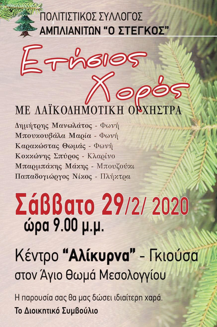 Ο Πολιτιστικός Σύλλογος Αμπλιανιτών ‘Ο ΣΤΕΓΚΟΣ’ με λαϊκοδημοτική ορχήστρα διοργανώνει μια βραδιά με πολύ κέφι, χορό και εκπλήξεις.