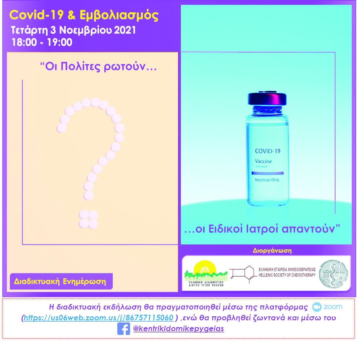Σήμερα το απόγευμα θα πραγματοποιηθεί η Καμπάνια Ενημέρωσης του Ελληνικού Διαδημοτικού Δικτύου Υγιών Πόλεων (ΕΔΔΥΠΠΥ) με τίτλο: “Covid-19 & Εμβολιασμός – Οι πολίτες ρωτούν, οι Ειδικοί Ιατροί απαντούν”.