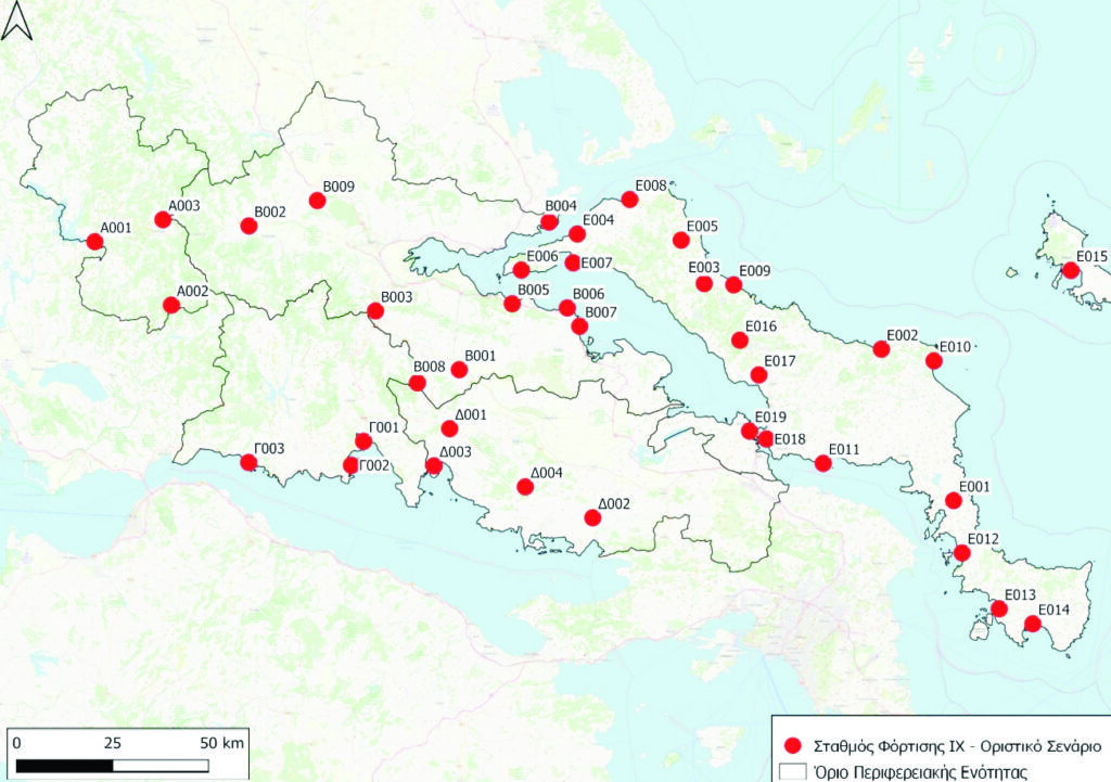 Το πρώτο σενάριο περιλαμβάνει την κατανομή των θέσεων φόρτισης με βάση την ισότιμη χωρική κατανομή και την πυκνότητα πληθυσμού.