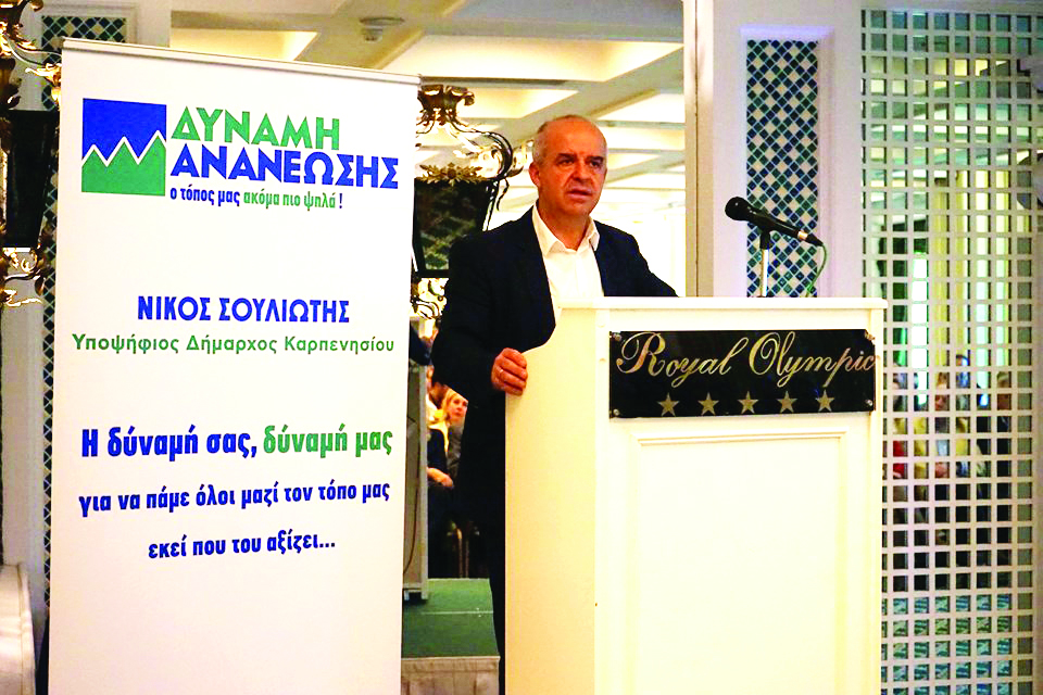 Την Κυριακή 12 Μαΐου 2019 πραγματοποιήθηκε η παρουσίαση του συνδυασμού «Δύναμη Ανανέωσης» στην Αθήνα παρουσία πλήθους ετεροδημοτών. Στην κατάμεστη από Ευρυτάνες αίθουσα του κεντρικού ξενοδοχείου της Αθήνας ο επικεφαλής του συνδυασμού και υποψήφιος Δήμαρχος Καρπενησίου Νίκος Σουλιώτης πραγματοποίησε ομιλία αναφερόμενος στο πολιτικό πρόγραμμα του συνδυασμού του και σε εξαγγελίες που στόχο έχουν την ανάπτυξη του τόπου. Όπως στο Καρπενήσι έτσι και στην Αθήνα προβλήθηκε ένα ολιγόλεπτο βίντεο που περιελάμβανε σημαντικά γεγονότα κατά την διάρκεια της τετραετούς θητείας του νυν Δημάρχου Καρπενησίου και ξανά υποψήφιου Δημάρχου κ. Νίκου Σουλιώτη. Στο βίντεο έγινε μια σύντομη αναφορά στα έργα υποδομής που υλοποίησε ο Δήμος Καρπενησίου με πρωταρχικό στόχο την παροχή των αγαθών που αξίζουν οι πολίτες του Δήμου. Προβλήθηκαν επίσης, οι τέσσερις (4) βραβεύσεις που έλαβε ο Δήμος Καρπενησίου, μια εκ των οποίων πρόκειται για διεθνή διάκριση, τόσο για τις σύγχρονες υποδομές όσο και για την διατήρηση του πρασίνου σε πολύ υψηλά επίπεδα. Τέλος, δεν παραλείφθηκε να γίνει αναφορά στις πολιτιστικό έργο του Δήμου που αποτελεί και ένα σημαντικό κομμάτι για την ανάδειξη του τόπου των παραδοσιακών εθίμων αλλά και των σύγχρονων δράσεων που προάγουν το πολιτιστικό πνεύμα και την αγάπη για τον τόπο.Στη συνέχεια, ο υποψήφιος Δήμαρχος Καρπενησίου παρουσίασε τους υποψήφιους Δημοτικούς του Συμβούλους, με κάποιους από αυτούς να απουσιάζουν. Ομιλία πραγματοποίησε και ο Περιφερειάρχης Στερεάς Ελλάδας κ. Κώστας Μπακογιάννης ο οποίος δήλωσε μεταξύ άλλων «περήφανος για τον Νίκο Σουλιώτη και την ομάδα του που διατηρούν υψηλό επίπεδο στον προεκλογικό λόγο παρά τις προκλήσεις που αντιμετωπίζουν». Ο ίδιος μάλιστα δεν παρέλειψε να αναφερθεί στα κονδύλια που εννιά χρόνια τώρα διατέθηκαν για τον Δήμο Καρπενησίου τα οποία ξεπέρασαν τα 100 εκατομμύρια ευρώ με σκοπό την βελτίωση του τόπου αλλά και της ζωής των πολιτών.