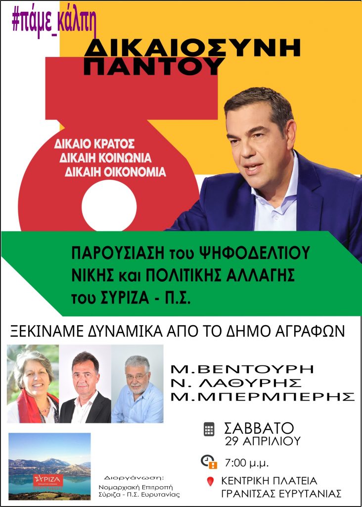 Το πρόγραμμα επισκέψεων των υποψηφίων βουλευτών του κόμματός στην Ευρυτανία συνεχίζεται και θα περιοδεύσουν από τις 26 Απριλίου έως και τις 2 Μαΐου έχει ως εξής: