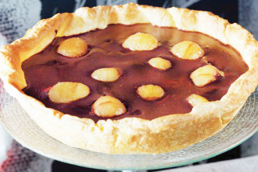 Αρχικά, ετοιμάζετε τη σοκολατένια γέμιση: Κόβετε την κουβερτούρα σε μικρά κομματάκια. Σε κατσαρολάκι ζεσταίνετε καλά την κρέμα γάλακτος μαζί με το κονιάκ, ανακατεύοντας συνεχώς. Λίγο πριν πάρουν βράση τα αποσύρετε από τη φωτιά και ρίχνετε μέσα την ψιλοκομμένη κουβερτούρα. Αφήνετε τη σοκολάτα να λιώσει σιγά σιγά ανακατεύοντας συνεχώς. Προθερμαίνετε το φούρνο στους 180οC. Βουτυρώνετε μια φόρμα για τάρτα και απλώνετε μέσα το φύλλο σφολιάτας, φροντίζοντας να καλύψει τον πάτο και τα πλαϊνά της ταρτιέρας. Κόβετε ό,τι περισσεύει από τα τοιχώματα. Απλώνετε τα μαρόν γλασέ συμμετρικά πάνω στη ζύμη και ρίχνετε μέσα τη λιωμένη σοκολάτα. Σκεπάζετε την τάρτα με αντικολλητικό χαρτί ψησίματος και ψήνετε στο φούρνο για 40 λεπτά περίπου και μέχρι να ψηθεί η ζύμη. Αφήνετε την τάρτα να γίνει χλιαρή και την ξεφορμάρετε προσεκτικά. Σερβίρετε σε πιάτα και αν θέλετε, συνοδεύετε με μπάλες παγωτό βανίλια.