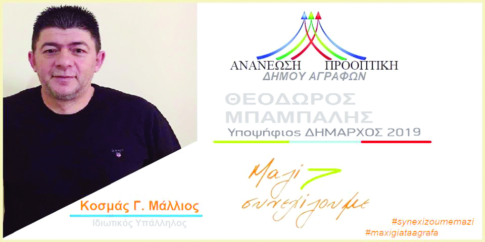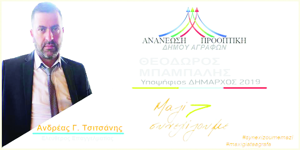 Νέες υποψηφιότητες και συγκεκριμένα τέσσερις (4) υποψήφιοι Δημοτικοί Σύμβουλοιπροστίθενται συνεχώς στον συνδυασμό του Θεόδωρου Μπαμπαλή ‘’Ανανέωση Προοπτική’’ συμπληρώνοντας το ψηφοδέλτιό του, έτοιμος να αντιμετωπίσει τους ετέρους υποψήφιους Δημάρχους. Τα νέα ονόματαγια τον Δήμο Αγράφων είναι η κα. Βάσια Μακρή του Ευσταθίου από το Ραπτόπουλο απόφοιτη τμήματος Τοπικής Αυτοδιοίκησης, η οποία θέτει υποψηφιότητα ως Δημοτική Σύμβουλος στην ΔΕ Ασπροποτάμου, ο κ. Κοσμάς Μάλλιος του Γεωργίου, Ιδιωτικός Υπάλληλος, με καταγωγή από την Γρανίτσα ως υποψήφιος Δημοτικός Σύμβουλος στην ΔΕ Απεραντίων, η κα. Θεοχάρη Γεωργία απόφοιτη Βρεφονηπιοκόμοςως υποψήφια Δημοτική Σύμβουλος στην ΔΕ Βίνιανης και ο κ. Τσιτσάνης Ανδρέας του Γεωργίου από το ΡαπτόπουλοΕλεύθερος Επαγγελματίας, ως υποψήφιος Δημοτικός Σύμβουλος στην ΔΕ Ασπροποτάμου.