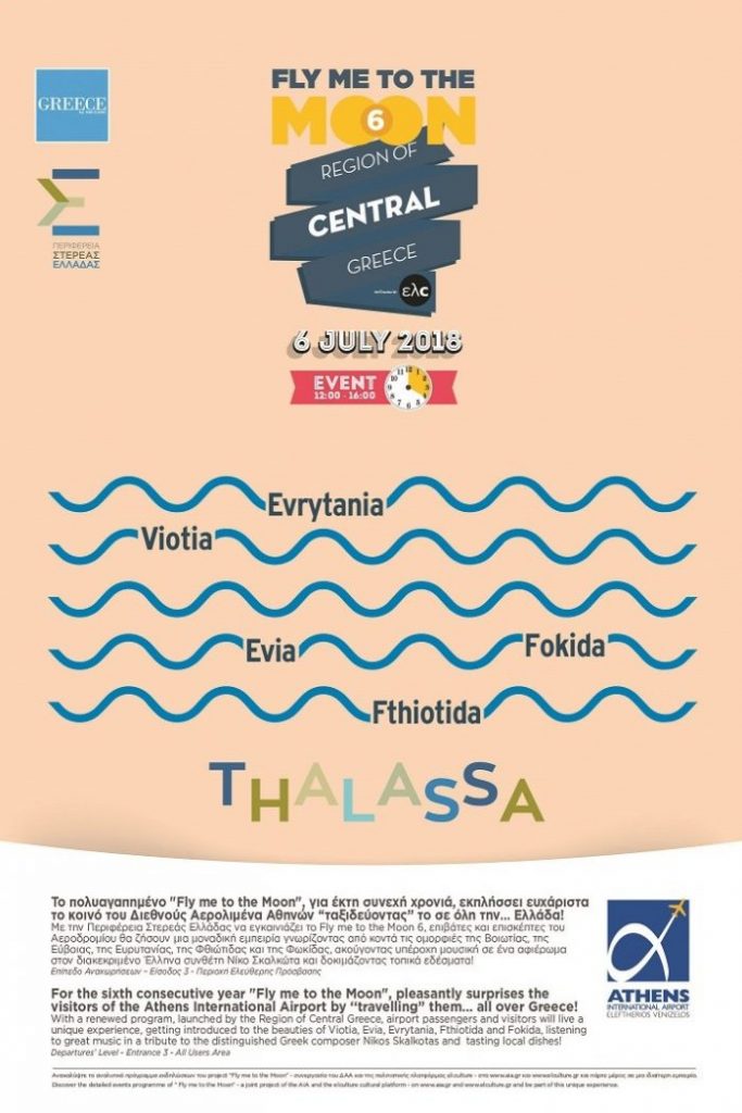 Για έκτη συνεχή χρονιά η Περιφέρεια Στερεάς Ελλάδας βρίσκει την ευκαιρία να διαφημίσει τις ομορφιές και τον πολιτισμό στης κεντρικής Ελλάδας στην αναμενόμενη εκδήλωση “Fly me to the Moon”, που θα πραγματοποιηθεί την Παρασκευή 6 Ιουλίου, στον Εθνικό Αερολιμένα, Ελευθέριος Βενιζέλος.