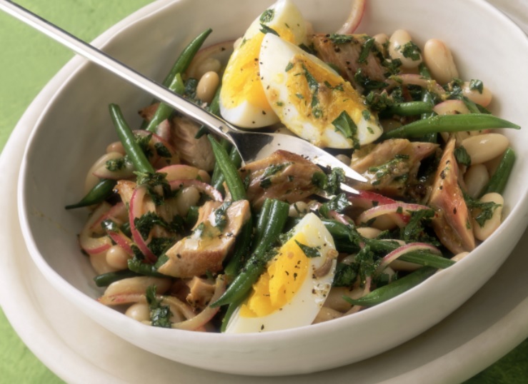Βράζετε τα φασολάκια σε αλατισμένο νερό 15’. Τα στραγγίζετε και τα αφήνετε να κρυώσουν. Ετοιμάζετε το ντρέσινγκ ως εξής: πολτοποιείτε στο μπλέντερ το σκόρδο και προσθέτετε στη σειρά το αλάτι, το ξίδι, το πιπέρι, το λάδι και τη μουστάρδα. Χτυπάτε όλα τα υλικά πολύ καλά. Ρίχνετε σε μια σαλατιέρα τα φασολάκια, τις πατάτες (ή τα φασόλια), τον τόνο, το μαϊντανό, το κρεμμύδι, αλατοπιπερώνετε και ανακατεύετε ελαφρά. Γαρνίρετε με τα αυγά και τις ελιές, περιχύνετε με τη σάλτσα και σερβίρετε.