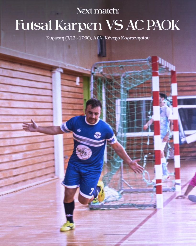 Το Αθλητικό Κέντρο Καρπενησίου ανοίγει τις πόρτες του την Κυριακή 03/12 στις 17:00 για τη μάχη που θα διεξαχθεί ανάμεσα στο Καρπενήσι futsal και τον ΠΑΟΚ στο πλαίσιο της 7ης αγωνιστικής.