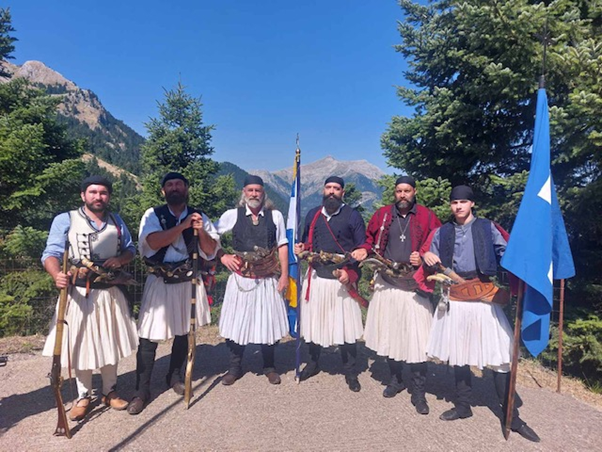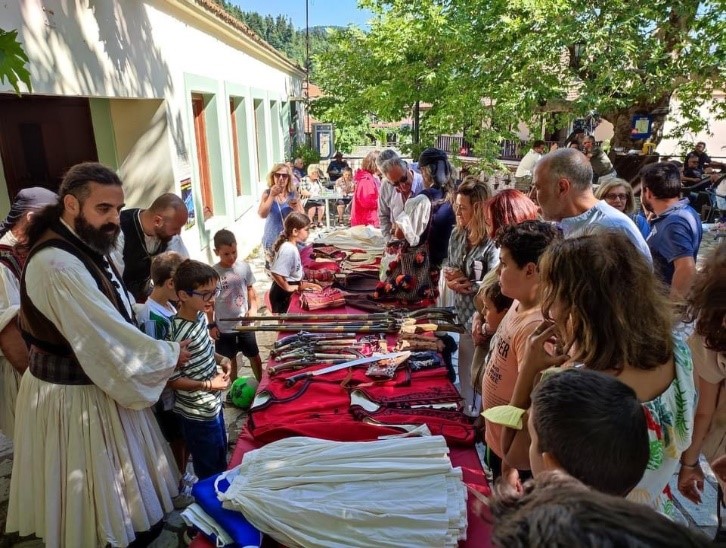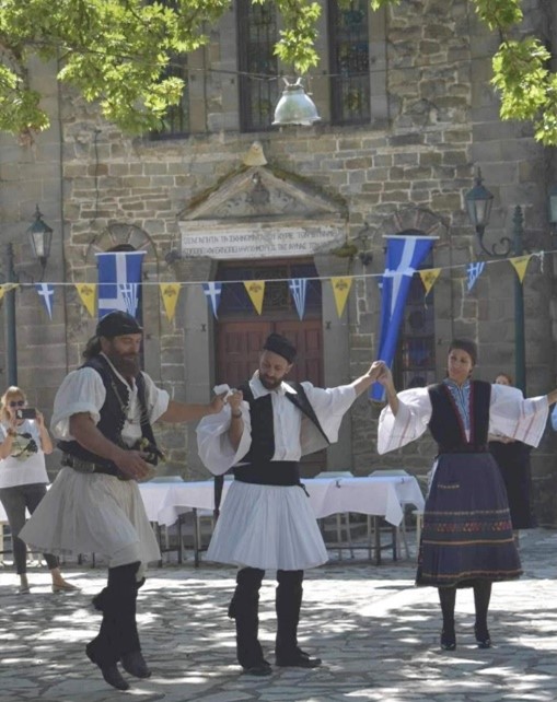 Και μετά, στην πλατεία του χωριού τα εμπράγματα πειστήρια εκείνου του ηρωικού χρόνου, τα όπλα, που αφέθηκαν στο θαυμασμό των ανθρώπων. Μετά στον ίδιο χώρο, το στρώσιμο της τάβλας με όλη τη διατροφική αξιοπρέπεια του τόπου και η κοινωνία της κοινής τράπεζας, το τραγούδι, οι μπαταριές και ο χορός των αρματωμένων και ο κρουστός χορός του Νίκου Βλαχόπουλου, ως το χαίρε του Έλληνα του μυημένου στο ιστορικό του κέντρο. Τα βήματα του Νίκου Βλαχόπουλου στο χορό, σαν μια συνομιλία της περηφάνιας, θα ακολουθήσουν οι αρματω-μένοι Γιώργος Κατσιάρης και Νίκος Γιαννακόπουλος από το Κρίκελλο και Θόδωρος Νάκος από το Μεγάλο Χωριό.