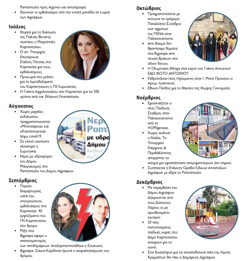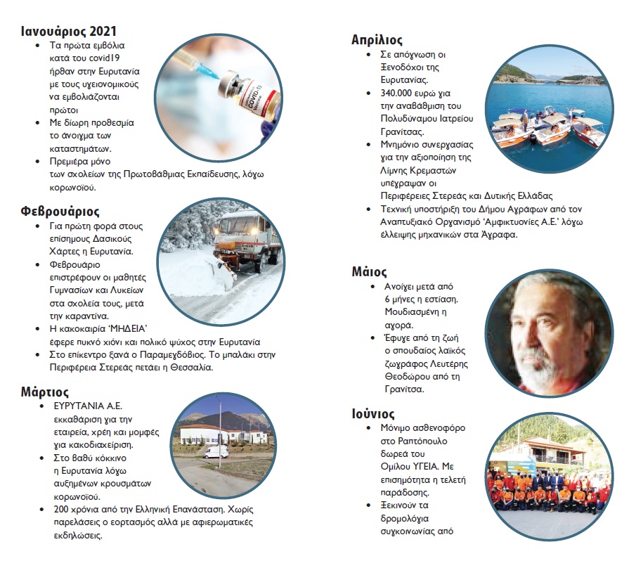 Στο τέλος του έφτασε το 2021 και μας αφήνει μια μάλλον γλυκο-πικρή γεύση. Με πρωταγωνιστή και αυτή τη χρονιά την πανδημία του covid19 και τις μεταλλάξεις του, αλλά και τις δικαστικές περιπέτειες, τις πολιτικές συγκρούσεις, τα έργα και τις καταστροφές, ο Ευρυτανικός Παλμός αποτύπωσε μέσα από τις σελίδες του τα γεγονότα αντικειμενικά και ψύχραιμα, όπως πάντα. Ας δούμε λοιπόν τι έγινε τη χρονιά που μόλις τελείωσε.
