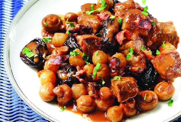 Ζεσταίνουμε το ελαιόλαδο σε κατσαρόλα και ροδίζουμε το μπέικον να γίνει τραγανό, για 4΄- 5΄. Το βγάζουμε σε απορροφητικό χαρτί. Όταν κρυώσει το ψιλοκόβουμε και το κρατάμε για αργότερα. Στεγνώνουμε το κρέας σε απορροφητικό χαρτί, το αλατοπιπερώνουμε και το αλευρώνουμε. Το ροδίζουμε στην κατσαρόλα να κάνει χρώμα απ’ όλες τις πλευρές. Τα κομμάτια που ροδίζουν τα βγάζουμε σε πιατέλα και συνεχίζουμε με τα υπόλοιπα. Όταν όλα τα κομμάτια είναι έτοιμα, τα ξαναβάζουμε στην κατσαρόλα. Προσθέτουμε τον πελτέ, σβήνουμε με το κονιάκ και τρίβουμε την κατσαρόλα. Προσθέτουμε το κρασί, το ζωμό και το αρωματικό μπουκέτο. Αφήνουμε να πάρει βράση για 15΄, μετά χαμηλώνουμε τη φωτιά, σκεπάζουμε και σιγοβράζουμε για 50΄ με 1 ώρα, να μισομαλακώσει το κρέας. Ζεσταίνουμε 2 κ.σ. ελαιόλαδο σε τηγάνι. Προσθέτουμε το σκόρδο, τα κρεμμυδάκια, τα δαμάσκηνα και τα μανιτάρια και τα σοτάρουμε για 5΄. Αλατοπιπερώνουμε και τα ρίχνουμε στην κατσαρόλα με το φαγητό. Δυναμώνουμε λίγο τη φωτιά και βράζουμε για επιπλέον 30΄, μέχρι να μαλακώσει τελείως το κρέας. Ρίχνουμε στη σάλτσα (εκτός φωτιάς) το παγωμένο βούτυρο σε κομματάκια. Κουνάμε απαλά την κατσαρόλα να λιώσει το βούτυρο και να γυαλίσει η σάλτσα. Πασπαλίζουμε δηλαδή με μαϊντανού και ξεροψημένο, ψιλοκομμένο μπέικον.