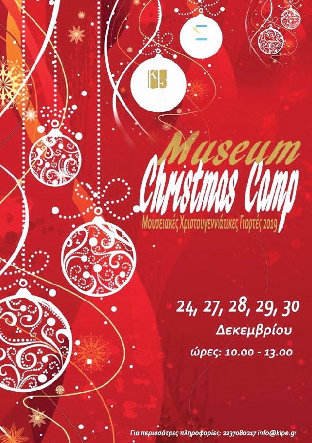 Το «Museum Christmas Camp-Μουσειακές Χριστουγεννιάτικες Γιορτές 2019», ανοίγει τις πόρτες του στο ΚΙΠΕ την πρώτη μέρα των διακοπών των μικρών μας φίλων, στις 24 Δεκεμβρίου και θα διαρκέσει 5 μέρες. Οι μέρες που θα διεξαχθούν τα εργαστήρια είναι 24/12, 27/12, 28/12, 29/12, 30/12 και ώρες 10.00-13.00, η είσοδος είναι ελεύθερη για όλους.