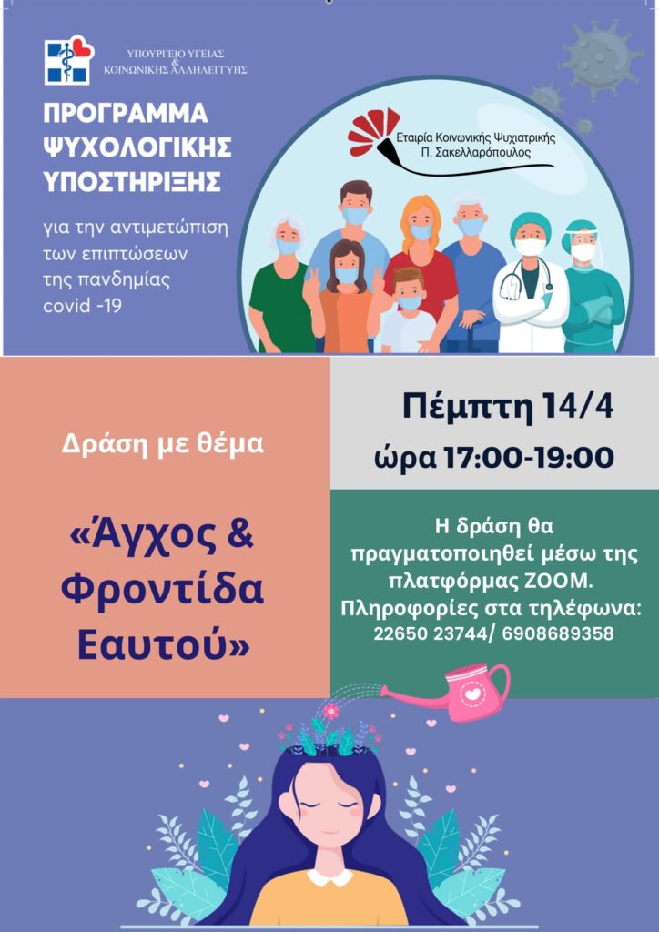 Το Πρόγραμμα «Κανένας μόνος στην πανδημία» της Εταιρίας Κοινωνικής Ψυχιατρικής Π. Σακελλαρόπουλος στον Νομό Φωκίδας, το οποίο υλοποιείται από τις αρχές του 2021 με το συντονισμό, τη χρηματοδότηση και την εποπτεία του Υπουργείου Υγείας και της Ομοσπονδίας Φορέων Ψυχοκοινωνικής Αποκατάστασης και Ψυχικής Υγείας “ΑΡΓΩ” πρόκειται να υλοποιήσει ψυχοεκπαίδευση με θέμα «Άγχος & Φροντίδα Εαυτού» και απευθύνεται στους κατοίκους του Δήμου Αγράφων.