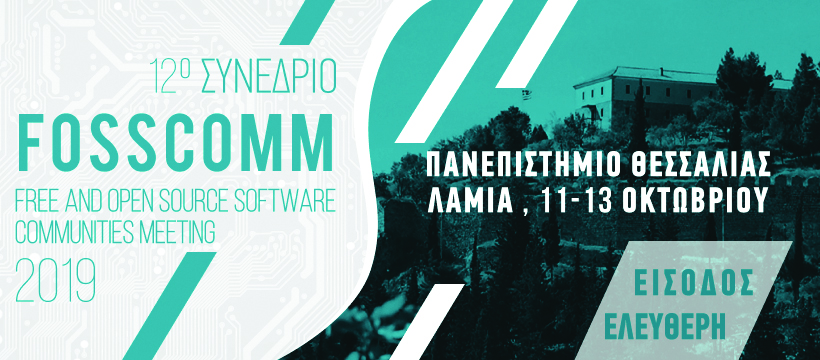 12o Συνέδριο Fosscomm. Το FOSSCOMM (Free and Open Source Software Communities Meeting) είναι ένα ετήσιο πανελλήνιο συνέδριο κοινοτήτων ελεύθερου λογισμικού και λογισμικού ανοικτού κώδικα. Απευθύνεται σε προγραμματιστές, φοιτητές και γενικά σε όποιους ενδιαφέρονται για το open source ανεξαρτήτως του γνωστικού τους υποβάθρου. Συμμετέχουν κοινότητες ανοικτού λογισμικού, ομάδες προγραμματιστών και συντελεστών έργων. Το συνέδριο έχει ευρεία θεματολογία, από τεχνικά ζητήματα και workshops, μέχρι μεταφράσεις, νομικά θέματα, θέματα πολιτικής σχετικά με το ελεύθερο/ανοικτό λογισμικό κ.α. Είσοδος Ελέυθερη.