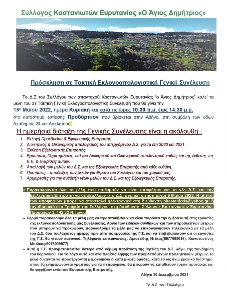 Πρόσκληση σε Τακτική Γενική Εκλογοαπολογιστική Γενική Συνέλευση του Συλλόγου Καστανιωτών Ευρυτανίας, η οποία θα πραγματοποιηθεί την