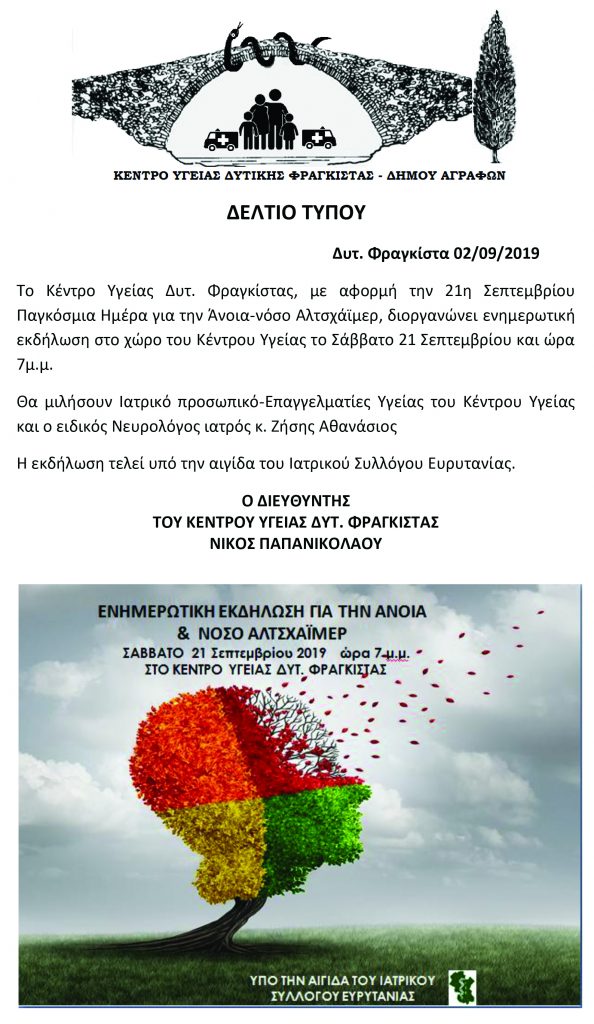 Σάββατο 21/9/2019 Δυτ. Φραγκίστας (Κέντρο Υγείας) Ημερίδα. Το Κέντρο Υγείας Δυτ. Φραγκίστας, με αφορμή την 21η Σεπτεμβρίου Παγκόσμια Ημέρα για την Άνοια-Νόσος Αλτσχάϊμερ. Θα μιλήσουν Ιατρικό προσωπικό- Επαγγελματίες Υγείας του Κέντρου Υγείας και ο ειδικός Νευρολόγος ιατρός κ. Ζήσης Αθανάσιος. Η εκδήλωση τελεί υπό την αιγίδα του Ιατρικού Συλλόγου Ευρυτανίας | Ώρα 7μ.μ.