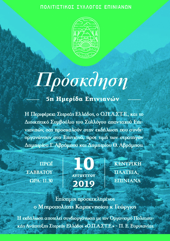 Σάββατο 10/8/2019 Επινιανά (Κεντρική Πλατεία Καρπενησίου) 5η Ημερίδα προς τιμή των στρατηγών Δημητρίου Γ. Αβράμπου και Δημητρίου Θ. Αβράμπου Με τη διοργάνωση του Πολιτιστικού Συλλόγου Επινιανών. Επίσημος προσκεκλημένος ο Μητροπολίτης Καρπενησίου κ.κ. Γεώργιος |Ώρα 11.30 π.μ.