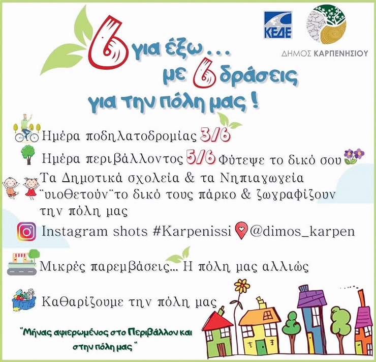Με αφορμή την Παγκόσμια Ημέρα Περιβάλλοντος γιορτάζεται κάθε χρόνο στις 5 Ιουνίου και αποτελεί την κύρια εκδήλωση του ΟΗΕ από το 1972 για την ενημέρωση του παγκόσμιου κοινού σχετικά με περιβαλλοντικά προβλήματα που αντιμετωπίζει η ανθρωπότητα, ο Δήμος Καρπενησίου διοργανώνει 6 περιβαλλοντικές δράσεις για τον μήνα Ιούνιο. Ο μήνας αφιερωμένος στο περιβάλλον ξεκινάει στις 3 Ιουνίου με ποδηλατοδρομία, ενώ ανήμερα της Παγκόσμιας Ημέρας Περιβάλλοντος διοργανώνεται δράση για με τα Δημοτικά Σχολεία και τα Νηπιαγωγεία της πόλης να ‘υιοθετούν’ το πάρκο τους, να φυτεύουν λουλούδια και να ζωγραφίζουν την πόλη. Ακολουθούν οι δράσεις: ‘Μικρές παρεμβάσεις… Η πόλη αλλιώς΄΄ και το ΄Καθαρίζουμε την πόλη μας’, με τις οποίες ολοκληρώνεται η δράση. Σύντομα αναμένεται ο δήμος να ανακοινώσει και με επίσημο δελτίο τύπου τις σχετικές λεπτομέρειες για την υλοποίηση των δράσεων.