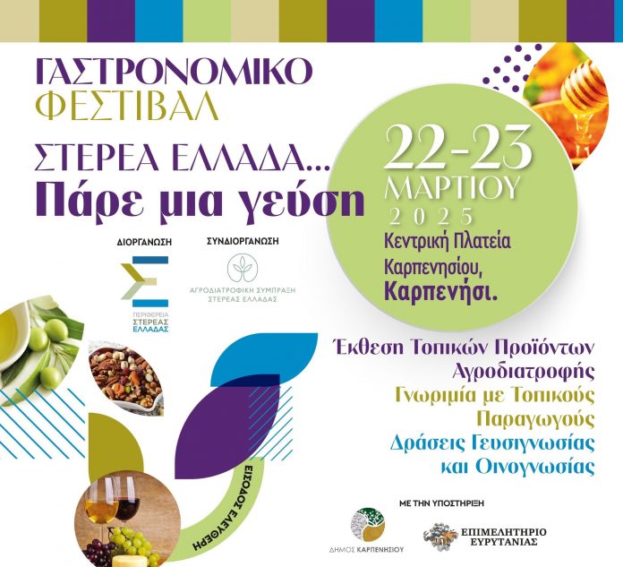 H Περιφέρεια Στερεάς Ελλάδας και η Αγροδιατροφική Σύμπραξη Στερεάς Ελλάδας διοργανώνουν στις 22 και 23 Μαρτίου στο Καρπενήσι το Γαστρονομικό Φεστιβάλ Προϊόντων «ΣΤΕΡΕΑ ΕΛΛΑΔΑ…ΠΑΡΕ ΜΙΑ ΓΕΥΣΗ. Το 2μερο Φεστιβάλ έχει σαν στόχο να αποτελέσει πόλο έλξης για πλήθος επισκεπτών, καθώς το πρόγραμμα περιλαμβάνει επιδείξεις παρασκευής παραδοσιακών συνταγών από την Περιφέρεια Στερεάς Ελλάδας και άλλα δρώμενα.