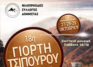18η Γιορτή Τσίπουρου. 3ήμερο γλέντι με ζωντανή μουσική. Διοργάνωση ο Φιλοπρόοδος Σύλλογος Δομνίστας.