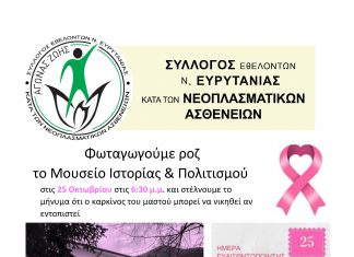 Άλλη μία δράση ενημέρωσης και ευαισθητοποίησης θα πραγματοποιηθεί την Τετάρτη 25 Οκτωβρίου από τον Σύλλογο Εθελοντών Ν. Ευρυτανίας κατά των Νεοπλασματικών Ασθενειών ‘‘Αγώνα Ζωής’’....