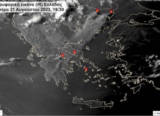 Την έκταση των δασικών πυρκαγιών που εκδηλώθηκαν τη Δευτέρα 21 Αυγούστου και παραμένουν ενεργές μέχρι και τώρα αποτυπώνει εικόνα από τον ευρωπαϊκό δορυφόρο METEOSAT-11.