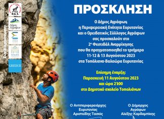Ο Δήμος Αγράφων, η Περιφερειακή Ενότητα Ευρυτανίας και ο Ορειβατικός Σύλλογος Αγράφων σας προσκαλούν στο 2ο Φεστιβάλ Αναρρίχησης που θα πραγματοποιηθεί το τριήμερο 11-13 Αυγούστου...