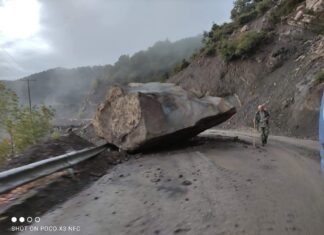 Λόγω των έντονων βροχοπτώσεων των τελευταίων ημερών, ένας τεράστιος βράχος αποκολλήθηκε από το βουνό κι έπεσε στο δρόμο, ευτυχώς χωρίς θύματα