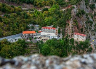 Ψηλά, στὶς ἐλατόφυτες βουνοκορφὲς τῆς νοτιοδυτικῆς Εὐρυτανίας, καὶ σφηνωμένη ἀνάμεσα σὲ κάθετους γκριζωποὺς βράχους...