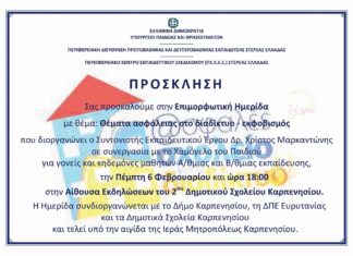 Επιμορφωτική Ημερίδα. Με την συνδιοργάνωση του Δήμου Καρπενησίου, της ΔΠΕ Ευρυτανίας, των Δημοτικών Σχολείων Καρπενησίου, σε συνεργασία με το ‘Χαμόγελο του Παιδιού’ και υπό...