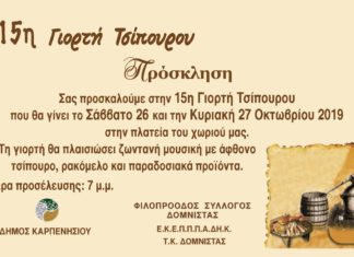 Ο Φιλοπρόοδος Σύλλογος Δομνίστας, σας προσκαλεί στην 15η Γιορτή Τσίπουρου που θα πραγματοποιηθεί στην πλατεία του χωριού το Σάββατο 26 και την Κυριακή 27...