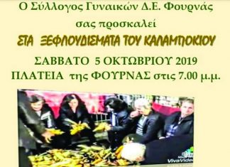 Το Σάββατο 5/10/2019 , ώρα 19.00 μ.μ. στην Φουρνά, θα πραγματοποιηθεί η αναβίωση παραδοσιακού εθίμου ¨Στα ξεφλουδίσματα του καλαμποκιού¨. Την εκδήλωση διοργανώνει όπως...