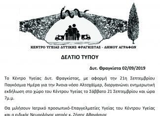 Σάββατο 21/9/2019 Δυτ. Φραγκίστας (Κέντρο Υγείας) Ημερίδα. Το Κέντρο Υγείας Δυτ. Φραγκίστας, με αφορμή την 21η Σεπτεμβρίου Παγκόσμια Ημέρα για την Άνοια-Νόσος Αλτσχάϊμερ. Θα...