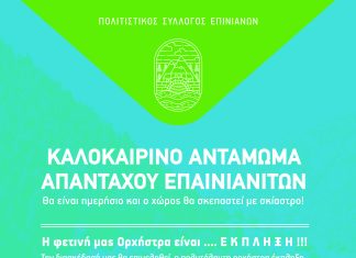 Κυριακή 11/8/2019 Επινιανά (Προαύλιο Χώρο Δημοτικού Σχολίου) Καλοκαιρινό Αντάμωμα Απανταχού Επαινιανιτών, με φαγητό, ποτό, μουσική και χορό |Ημερήσιο