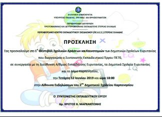 Τετάρτη 12/6/2019 Καρπενήσι (Αίθ. Εκδηλώσεων 2ου Δημοτικού Σχολείου) 1ο Φεστιβάλ Σχολικών Δράσεων και Καινοτομιών. Τα Δημοτικά Σχολεία Ευρυτανίας σε συνεργασία με την Α/βάθμια Εκπαίδευση...
