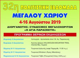4- 16/8/2019 Μεγάλο Χωριό 32η Πολιτιστική Εβδομάδα. Ο Σύνδεσμος Μεγαλοχωριτών ‘Η Αγία Παρασκευή’ διοργανώνει και φέτος δυο εβδομάδες πολιτιστικών εκδηλώσεων που περιλαμβάνουν τουρνουά, αγώνες...