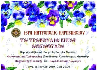 Τρίτη 11/6/2019 Καρπενήσι (Συνεδριακό Κέντρο) Θερινὴ εκδήλωση των μαθητών των Σχολών: Φωνητικής και Ορθοφωνίας (υπεύθυνος: Χρυσόστομος Μαλάτος) & Βυζαντινής Μουσικής και Παραδοσιακών Οργάνων |...