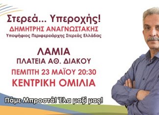 Την Πέμπτη 23 Μαΐου 2019 στην Πλατεία Αθ. Διάκου της Λαμίας στις 20:30 θα