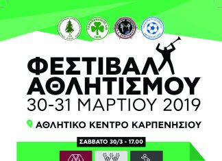 30 -31/3/2019 στο Καρπενήσι (Αθλητικό Κέντρο) θα πραγματοποιηθεί Φεστιβάλ Αθλητισμού. Πολεμικές τέχνες, Ενόργανη γυμναστική, Ποδόσφαιρο για 2 ημέρες με συνδιοργάνωση αθλητικών σωματίων.